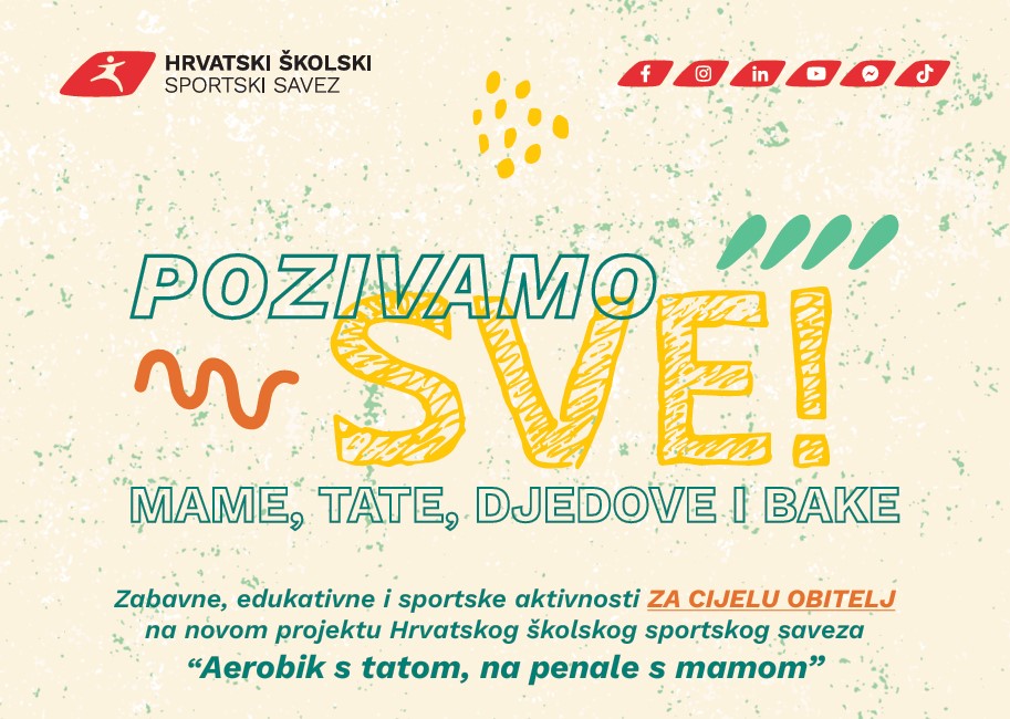 Novi pilot-projekt Hrvatskog školskog sportskog saveza okuplja učenice i učenike te njihove obitelji uz stručno vodstvo kineziologa na školskim igralištima i sportskim dvoranama! Dvadeset škola iz cijele Hrvatske svake druge subote tijekom školske godine organizirat će sportske, edukativne i rekreativne aktivnosti u kojima mogu sudjelovati svi – djeca i mladi te njihovi roditelji, bake i djedovi.HŠSS ponosno najavljuje rekreativni projekt okupljanja obitelji na školskih igralištima, inicijativu „Aerobik s tatom, na penale s mamom“ kojom bismo školska igrališta diljem Republike Hrvatske pretvorili u centar sportskih događanja i radosno mjesto okupljanja malih i velikih zajednica.Hrvatski školski sportski savez kineziolozima želi omogućiti prostor i uvjete za organiziranje rekreativnih aktivnosti u kojima mogu uživati djeca sa svojim bližnjima, a uz to razvijati interes za sport i sportske aktivnosti, a sve s ciljem povezivanja i socijalizacije kroz sport i rekreaciju.